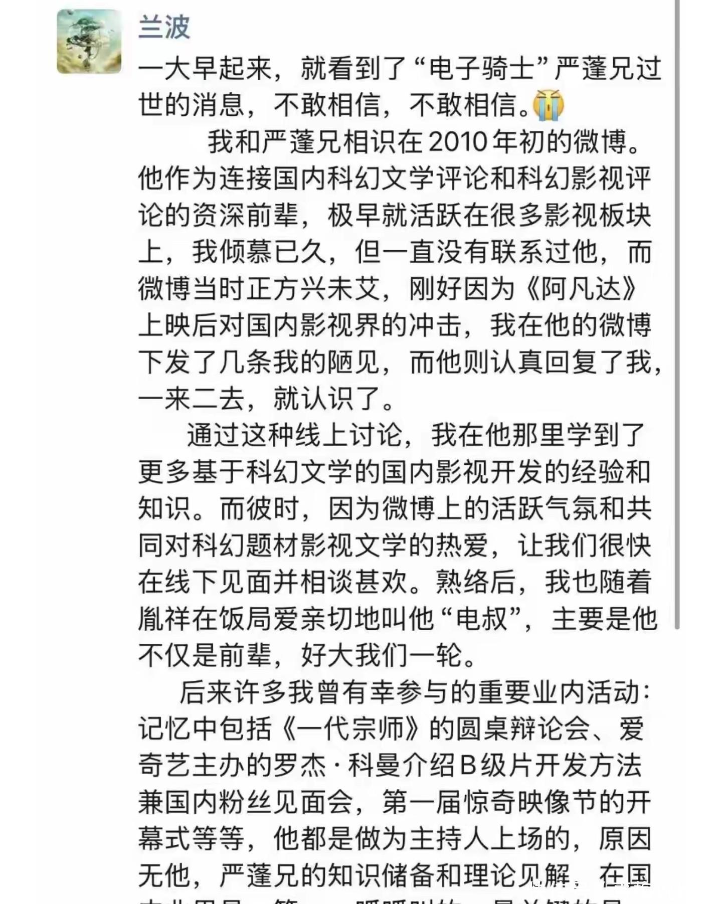 2025年11月9日晚9点30分,一则令人痛心疾首的消息如重磅炸弹般在影视与科幻圈炸开——知名影评人、科幻文化研究者严蓬(笔名“电子骑士”)因肝昏迷不幸离世,年仅XX岁。消息经影控传媒负责人证实后,迅速登上热搜榜,引发无数人的震惊与哀悼。